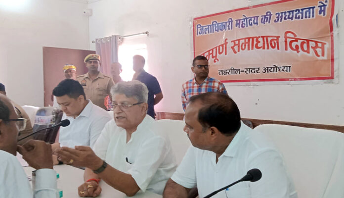 अयोध्या। तहसील सदर सभागार में शनिवार को सम्पूर्ण समाधान दिवस का आयोजन जिलाधिकारी निखिल टीकाराम फुंडे की अध्यक्षता में हुआ। कार्यक्रम में नगर विधायक वेद प्रकाश गुप्ता और वरिष्ठ पुलिस अधीक्षक डॉ. गौरव ग्रोवर भी मौजूद रहे।