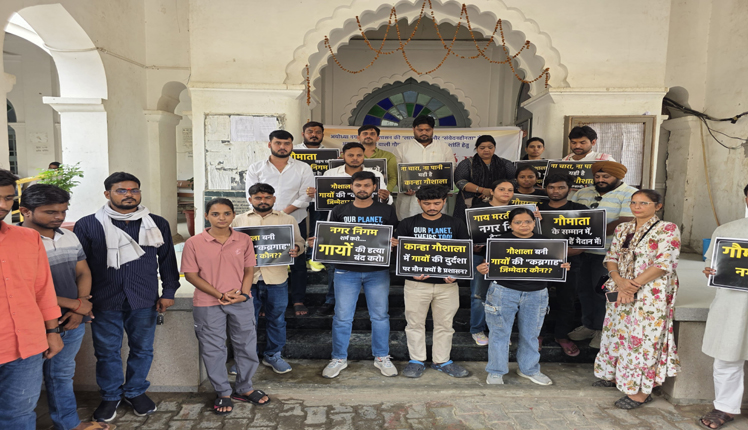 अयोध्या। कान्हा गौशाला में असमय गायों की मौत व नगर निगम पर संवेदनहीनता का आरोप लगाते हुए निगम परिसर श्रद्धांजलि सभा का अयोजन किया गया। श्रद्धांजली सभा का नेतृत्व शरद शुक्ला के नेतृत्व में किया हुआ। हाथों में स्लोगन लिखे बैनर लेकर पशुप्रेमियों ने नगर निगम तिलक हॉल के गेट पर प्रर्दशन किया। लापरवाह और जवाबदेह अधिकारियों कर्मचारियों को निलंबित करने की मांग की गई।