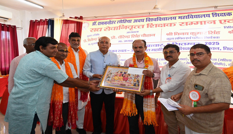 अयोध्या। डॉ. राममनोहर लोहिया अवध विश्वविद्यालय में शिक्षक दिवस के अवसर पर अवध विश्वविद्यालय कॉलेज टीचर्स एसोसिएशन (आक्टा) द्वारा भव्य सेवानिवृत्तशिक्षकोंकेसम्मानसमारोह का आयोजन किया गया। इस अवसर पर महाविद्यालयों के सेवानिवृत्त शिक्षकों के दीर्घ योगदान को याद करते हुए उन्हें सम्मानित किया गया।