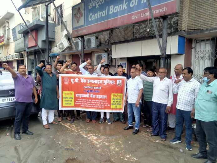 अयोध्या। ऑल इंडिया बैंक एम्प्लाइज एसोसिएशन, ऑल इंडिया बैंक ऑफिसर्स एसोसिएशन और बैंक एम्प्लाइज फेडरेशन ऑफ इंडिया के संयुक्त आह्वान पर बुधवार को अयोध्या में बैंक कर्मचारियों और अधिकारियों ने केंद्र सरकार की नीतियों के विरोध में प्रदर्शन किया।