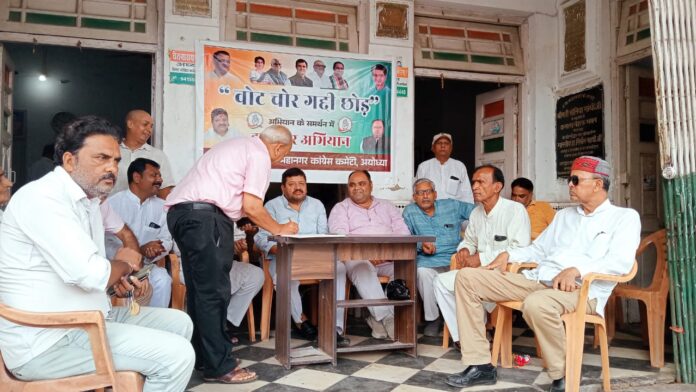 अयोध्या। कांग्रेस द्वारा चलाए जा रहे वोट चोर गद्दी छोड़ अभियान के समर्थन में जिला एवं महानगर कांग्रेस कमेटी द्वारा हस्ताक्षर अभियान चलाया गया। अभियान की शुरूआत जिलाध्यक्ष चेतनारायण सिंह ने किया। उन्होंने कहा कि जनता के साथ हुए विश्वासघात को कांग्रेस पार्टी बर्दाश्त नहीं करेगी। लोकतंत्र की रक्षा और जनता की आवाज़ बुलंद करने के लिए कांग्रेस का यह आंदोलन जारी रहेगा। महानगर अध्यक्ष सुनील कृष्ण गौतम ने कहा कि जनता का वोट चोरी कर सत्ता में बने रहना लोकतंत्र की हत्या है। कांग्रेस पार्टी जनता के हक की लड़ाई लड़ रही है और यह हस्ताक्षर अभियान उसी दिशा में एक सशक्त कदम है।