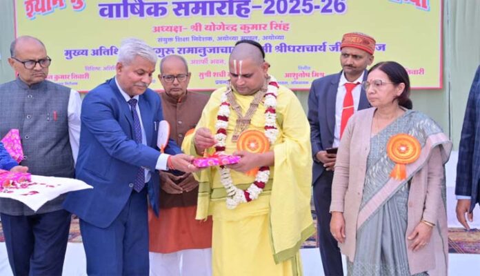 अयोध्या। शहर के एसएसवी इंटर कॉलेज का वार्षिक समारोह गरिमामय वातावरण में संपन्न हुआ। समारोह के मुख्य अतिथि अशर्फी भवन के पीठाधीश्वर जगतगुरु रामानुजाचार्य स्वामी श्री श्रीधराचार्य जी महाराज ने शिक्षा को जीवन की पूर्णता का आधार बताते हुए कहा कि जैसे मूर्तिकार साधारण शिला को दिव्य प्रतिमा का रूप देता है, वैसे ही शिक्षक विद्यार्थियों के जीवन को आकार देते हैं।