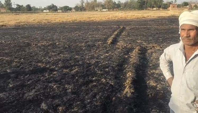 खड़ी गेहूं की फसल में लगी आग, ग्रामीणों ने मशक्कत कर पाया काबू