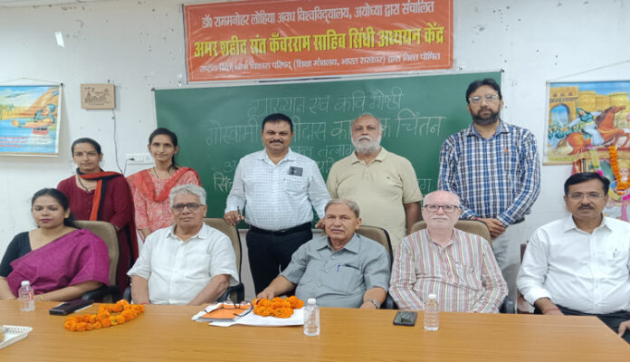 अयोध्या। श्रीराम मंगलावतार हैं और श्रीरामचरित मानस उनका ग्रंथावतार है यह विचार तुलसी साहित्य के मर्मज्ञ डॉ. जनार्दन उपाध्याय ने सोमवार को व्यक्त किए। वह डॉ. राममनोहर लोहिया अवध विश्वविद्यालय के अवधी भाषा विभाग, अखिल भारतीय साहित्य परिषद एवं अमर शहीद संत कंवरराम साहिब सिंधी अध्ययन केंद्र के संयुक्त तत्वावधान में आयोजित व्याख्यान एवं कवि गोष्ठी में मुख्य वक्ता के रूप में बोल रहे थे। कार्यक्रम का विषय था गोस्वामी तुलसीदास का लोक चिंतन