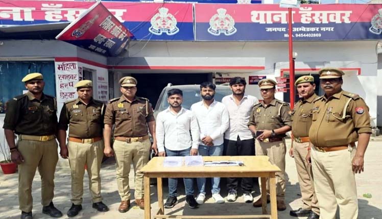 बसखारी, अम्बेडकर नगर। चेकिंग के दौरान हंसवर पुलिस ने अवैध तमंचे व चाकू के साथ स्कार्पियो सवार तीन युवकों को गिरफ्तार कर जेल की राह पकड़ा दी है। आरोपियों के पास से पुलिस ने 32 बोर देसी पिस्टल,चाकू,जिंदा कारतूस, पेटीएम बैंक मशीन, मोबाइल के साथ नगदी रुपए भी बरामद करने का दावा किया है। हंसवर पुलिस को यह सफलता शनिवार की देर शाम उस समय मिली, जब थाना क्षेत्र के 6 नम्बर पुलिया पर थाने के उप निरीक्षक मनोज कुमार सैनी अपने हमराही पुलिस कर्मियों के साथ संदिग्ध व्यक्तियों व वाहनों की चेकिंग कर रहे थे। इसी दौरान मुखबिर से सूचना मिली कि ग्राम हरसम्हार से बरही एदिलपुर की ओर जा रही एक काली स्कॉर्पियो में सवार तीन व्यक्तियों के पास अवैध हथियार हैं। और वे किसी आपराधिक घटना की फिराक में हैं।सूचना को गंभीरता से लेते हुए पुलिस टीम ने हरसम्हार गांव के पाठक पुरवा के निकट घेराबंदी कर स्कॉर्पियो को रोक लिया। और गाड़ी और अभियुक्तों की तलाशी ली तो उसमें से दो अवैध देशी तमंचा (.32 बोर), तीन जिंदा कारतूस तथा एक अवैध चाकू, एक पेटीएम मशीन, चार मोबाइल व ₹6390 नगदी बरामद हुआ। पुलिस ने स्कॉर्पियो समेत तीनों आरोपियों को थाने ले जाकर जब कड़ाई से पूछताछ की तो आरोपियों को अवैध हथियार सुल्तानपुर जनपद के विवेक नगर निवासी कृष कुमार मिश्रा के द्वारा उपलब्ध कराए जाने की बात पता चली। जिसकी गिरफ्तारी के लिए भी पुलिस ने प्रयास शुरू कर दिया है। पुलिस की गिरफ्त में आए आरोपियों की पहचान आकाश मिश्रा, अमन मिश्रा पुत्रगढ़ शारदा नंद निवासी तरौली मुबारकपुर थाना हंसवर तथा अमर पंडित निवासी रामपुरी सूर्यनगर थाना लिंक रोड, गाजियाबाद के रूप में हुई। तीनों का हाल पता थाना लिंक रोड गाजियाबाद बताया जा रहा है। जहां पर भी ये तीनों आपराधिक मामले में वांछित अभियुक्त बताये जा रहे हैं। मामले में पुलिस ने स्कॉर्पियो को एमबी एक्ट के तहत सीज करते हुए तीनों आरोपियों के विरुद्ध संबंधित धाराओं में मुकदमा पंजीकृत कर न्यायालय में प्रस्तुत किया जहां से उन्हें जेल भेज दिया गया है। इस मामले में हंसवर थाना अध्यक्ष ने बताया कि तीनों आरोपियों के विरुद्ध मुकदमा पंजीकृत न्यायालय में प्रस्तुत किया गया ,जहां से उन्हें जेल भेज दिया गया है। चौथे आरोपी की तलाश की जा रही है।