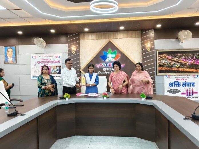 महिला कल्याण विभाग की ओर से दिव्यांशी को शील्ड प्रदान कर सम्मानित किया गया। कार्यक्रम के दौरान वन स्टॉप सेंटर प्रभारी प्रभा मणिपाल, चाइल्ड लाइन मिशन कोऑर्डिनेटर पल्लवी दीक्षित, परामर्शदाता प्रतिभा पांडे, जिला मिशन कोऑर्डिनेटर वंदना तिवारी, संध्या वर्मा, अमृता यादव सहित विद्यालय की प्रधानाचार्या व शिक्षक उपस्थित रहे।