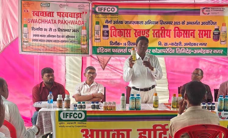 अंबेडकर नगर। विकासखंड स्तर पर बी पैक्स अशरफपुर बरवां साधन सहकारी समिति परिसर में इफको नैनो उर्वरक जागरूकता अभियान के तहत किसान सभा का आयोजन किया गया। कार्यक्रम में बड़ी संख्या में किसान शामिल हुए।