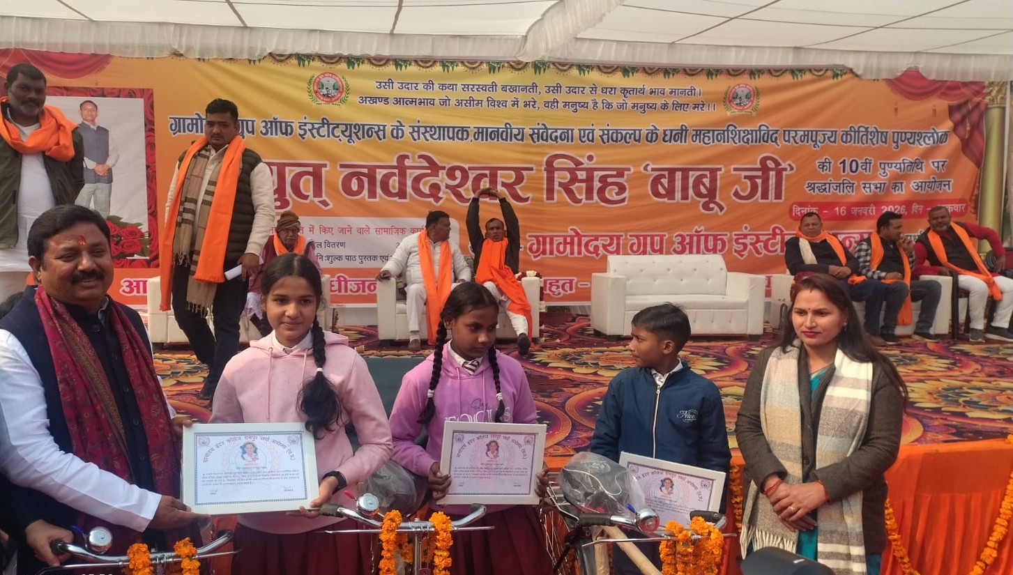 Ayodhya/Ambedkar Nagarअयोध्या शिक्षाविद की पुण्यतिथि पर मेधावी छात्रों को मिली साइकिल और पुस्तकें, खिल उठे चेहरे By amit_ayodhyasamachar - January 16, 2026 0 FacebookTwitterWhatsApp अयोध्या। रामपुर सर्धा स्थित ग्रामोदय ग्रुप ऑफ इंस्टीट्यूशंस के संस्थापक, प्रख्यात शिक्षाविद और समाजसेवी नर्वदेश्वर सिंह ‘बाबूजी’ की दसवीं पुण्यतिथि कॉलेज परिसर में श्रद्धा और गरिमा के साथ मनाई गई। कार्यक्रम में शिक्षकों, छात्रों और क्षेत्र के गणमान्य लोगों की बड़ी संख्या में उपस्थिति रही। समारोह का शुभारंभ पूर्व कार्यवाहक जिला पंचायत अध्यक्ष करुणाकर पांडे, संस्थान के निर्देशक डॉ. संदीप सिंह, प्रबंधक पी.एन. सिंह, इंजीनियर दीपक सिंह और चीफ प्रॉक्टर उग्रसेन सिंह द्वारा स्वर्गीय बाबूजी की प्रतिमा पर माल्यार्पण और पुष्प अर्पित कर श्रद्धांजलि देने के साथ हुआ। इसके बाद उपस्थित सभी लोगों ने पुष्पांजलि अर्पित कर उनके शिक्षा और समाज के प्रति योगदान को स्मरण किया। मुख्य अतिथि करुणाकर पांडे और संत श्री श्री कृपालु दास जी महाराज ने कार्यक्रम के दौरान मेधावी छात्राओं को साइकिल, पाठ्य पुस्तकें, बैग और प्रशस्ति पत्र प्रदान कर सम्मानित किया। सम्मान पाकर छात्राओं के चेहरे खुशी से खिल उठे। अतिथियों ने कहा कि शिक्षा ही समाज को आगे बढ़ाने का सबसे मजबूत माध्यम है और ऐसे प्रयास विद्यार्थियों को आगे बढ़ने के लिए प्रेरित करते हैं। कार्यक्रम के दौरान जरूरतमंदों के लिए कंबल वितरण भी किया गया। गत वर्षों की परंपरा को आगे बढ़ाते हुए इस वर्ष भी बड़ी संख्या में जरूरतमंदों को कंबल वितरित किए गए। कार्यक्रम के अंत में वक्ताओं ने पुण्यश्लोक नर्वदेश्वर सिंह ‘बाबूजी’ के विचारों और आदर्शों को अपनाने का आह्वान किया।