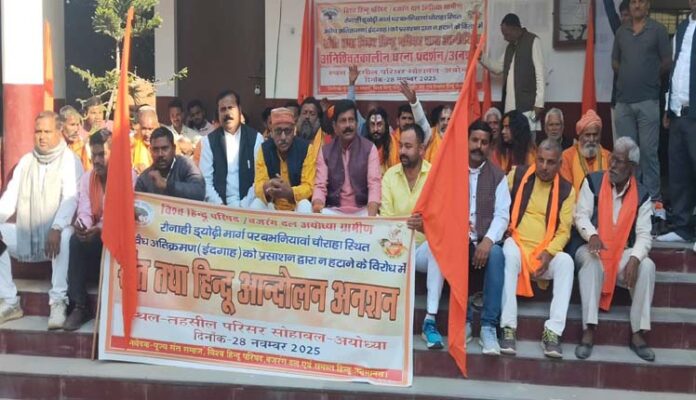 अयोध्या। सोहावल तहसील क्षेत्र के रौनाही–डेवढ़ी मार्ग पर सड़क चौड़ीकरण के दौरान कथित रूप में अतिक्रमण सूची में शामिल ईदगाह  को न हटाए जाने के विरोध में विहिप और बजरंग दल के कार्यकर्ताओं ने तहसील सोहावल परिसर में धरना देकर तत्काल कार्रवाई की मांग की। कार्यकर्ताओं का आरोप है कि सड़क चौड़ीकरण में पेड़, मकान और कई निर्माण हटाए गए, लेकिन डेवढी बाजार स्थित ईदगाह को अतिक्रमण में पाए जाने के बावजूद छोड़ दिया गया, जिसके कारण सड़क टेढ़ी बन गई और यातायात प्रभावित हो रहा है। उनका कहना है कि कई बार प्रशासन को प्रार्थना पत्र देकर नापजोख कराई गई, जिसमें ईदगाह का हिस्सा सड़क भूमि पर पाया गया, फिर भी कार्यवाही नहीं हुई। प्रदर्शनकारियों ने चेतावनी दी कि जब तक अतिक्रमण नहीं हटाया जाता, धरना जारी रहेगा।