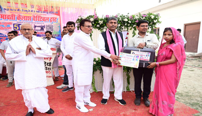 बसखारी अम्बेडकर नगर।प्रभावती कैलाश चैरिटेबल ट्रस्ट के संस्थापक/अध्यक्ष डा शरद यादव की पत्नी स्वर्गीय श्रद्धा यादव की प्रथम पुण्यतिथि पर ट्रस्ट के द्वारा 55 गरीब व असहाय महिलाओं को रोजगार सृजन हेतु सिलाई मशीन वितरित किया गया।