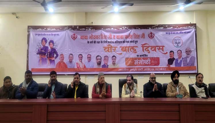 अयोध्या। वीर बाल दिवस के अवसर पर भारतीय जनता पार्टी द्वारा जनपद में विविध कार्यक्रमों का आयोजन किया गया। इस क्रम में राज्य मंत्री सतीश शर्मा ने खिड़की अली बेग स्थित गुरुद्वारा दुख निवारण में शबद कीर्तन में भाग लिया। इसके उपरांत उन्होंने परिसर में लगी प्रदर्शनी का उद्घाटन कर उसका अवलोकन किया। प्रर्दशनी का समापन रविवार को किया जाएगा। वहीं पार्टी कार्यालय पर संगोष्ठी का आयोजन कर वीर बालकों के शौर्य और बलिदान को स्मरण किया गया।
