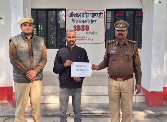 अंबेडकर नगर। साइबर क्राइम पुलिस थाना अंबेडकरनगर ने त्वरित और प्रभावी कार्रवाई करते हुए साइबर ठगी के शिकार एक कपड़ा व्यापारी को 7 लाख 88 हजार 998 रुपये की पूरी धनराशि वापस दिला दी। पुलिस की इस कार्रवाई से पीड़ित ने राहत की सांस ली है।