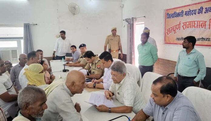 अयोध्या । तहसील सदर सभागार में शनिवार को आयोजित सम्पूर्ण समाधान दिवस में आम जनता की समस्याओं को लेकर अधिकारियों के सामने भीड़ उमड़ पड़ी। कार्यक्रम में विधायक वेद प्रकाश गुप्ता, जिलाधिकारी निखिल टीकाराम फुंडे और वरिष्ठ पुलिस अधीक्षक डॉ. गौरव ग्रोवर मौजूद रहे।